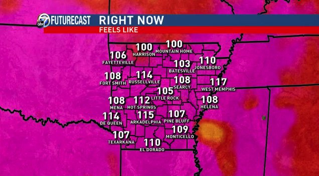 Temperatures across the south-central U.S. area will be similar today to those of Thursday, so it’s no wonder that we see widespread areas of excessive heat warnings and heat advisories: