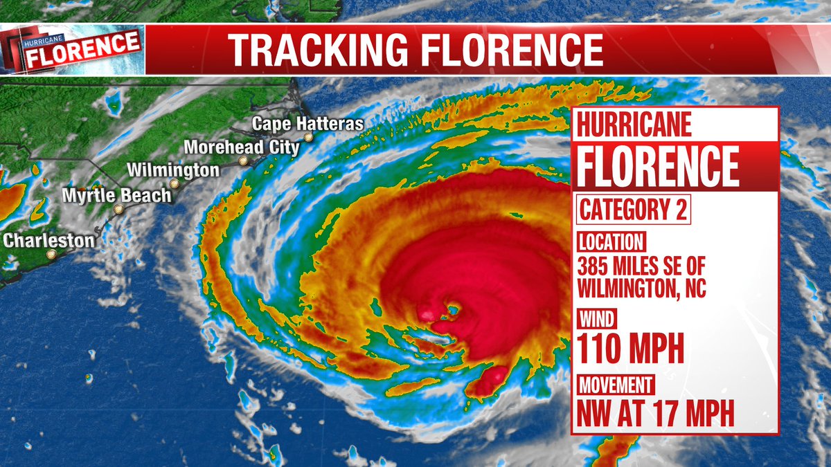 Breaking: is no longer a Major Hurricane – Now Cat 2 winds 110 mph.  Still a very large storm and will bring life threatening storm surge and inland flooding to Eastern NC in 18-24 hours