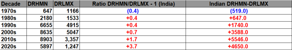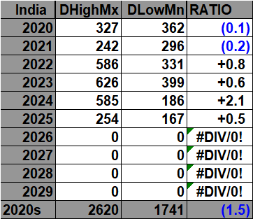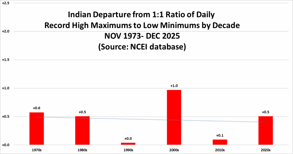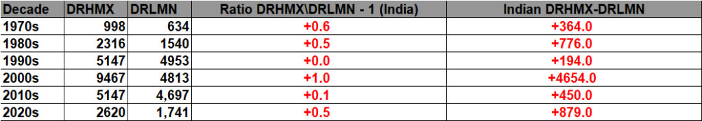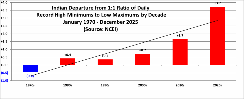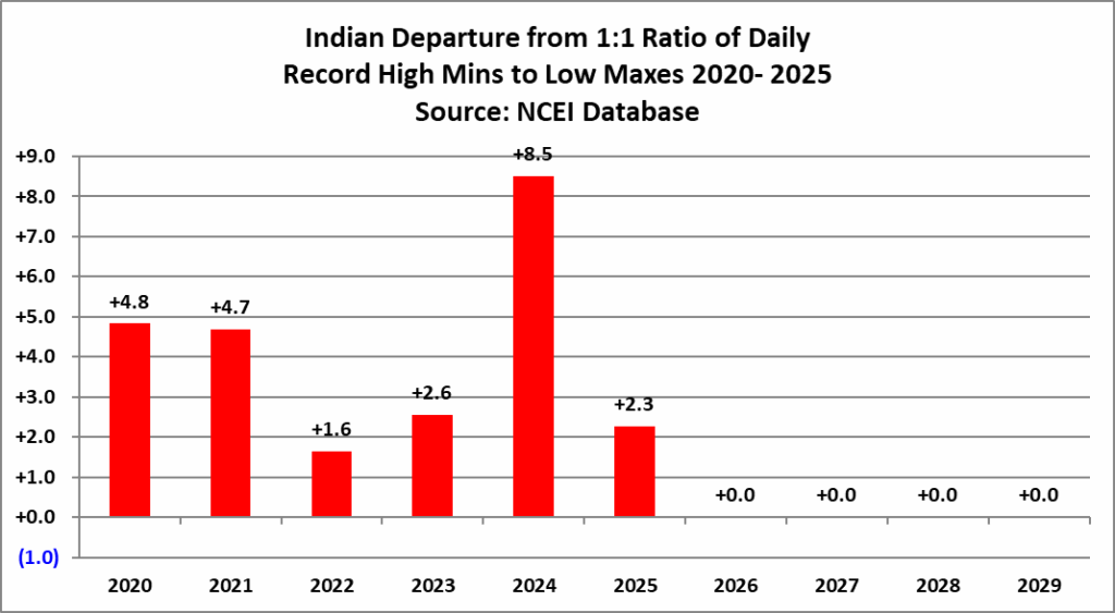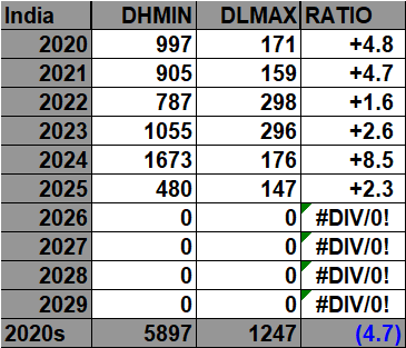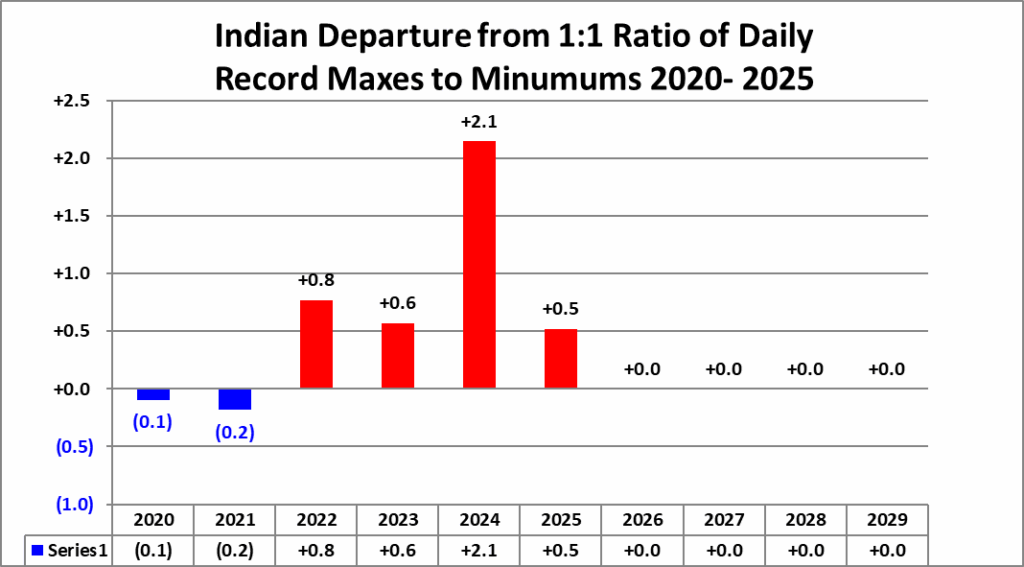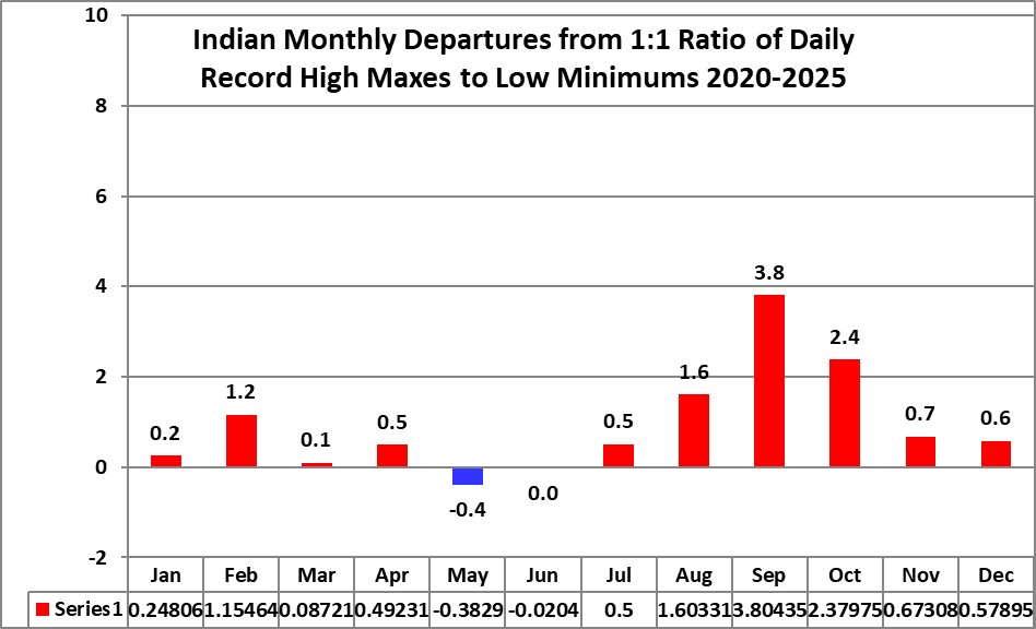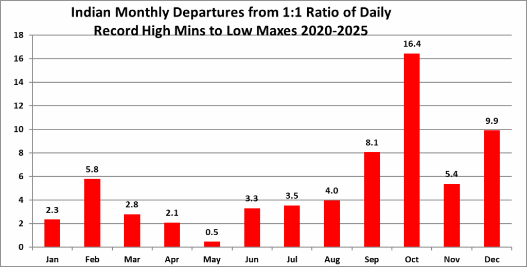All of the data listed below is part of this one chart. The ratio of daily record high minimums to low maximums for the 2020s (so far) is higher than any decade since the 1970s (For India):