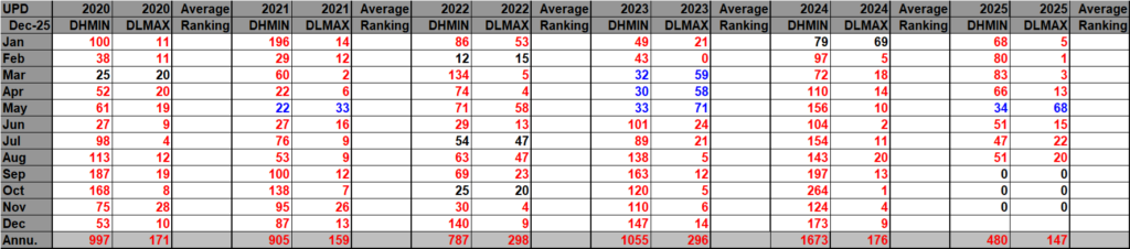 For the following data sets of record high minimums and low maximums blue colors represent cold months and red warm. Those months with counts close to a 1 to 1 ratio of highs to lows are colored black. There are no Indian reports of records prior to 1973. Time stamps for when I last updated counts are located in the upper left-hand corner of each chart. Drop me a note if you see an error or if you have suggestions for improvements.