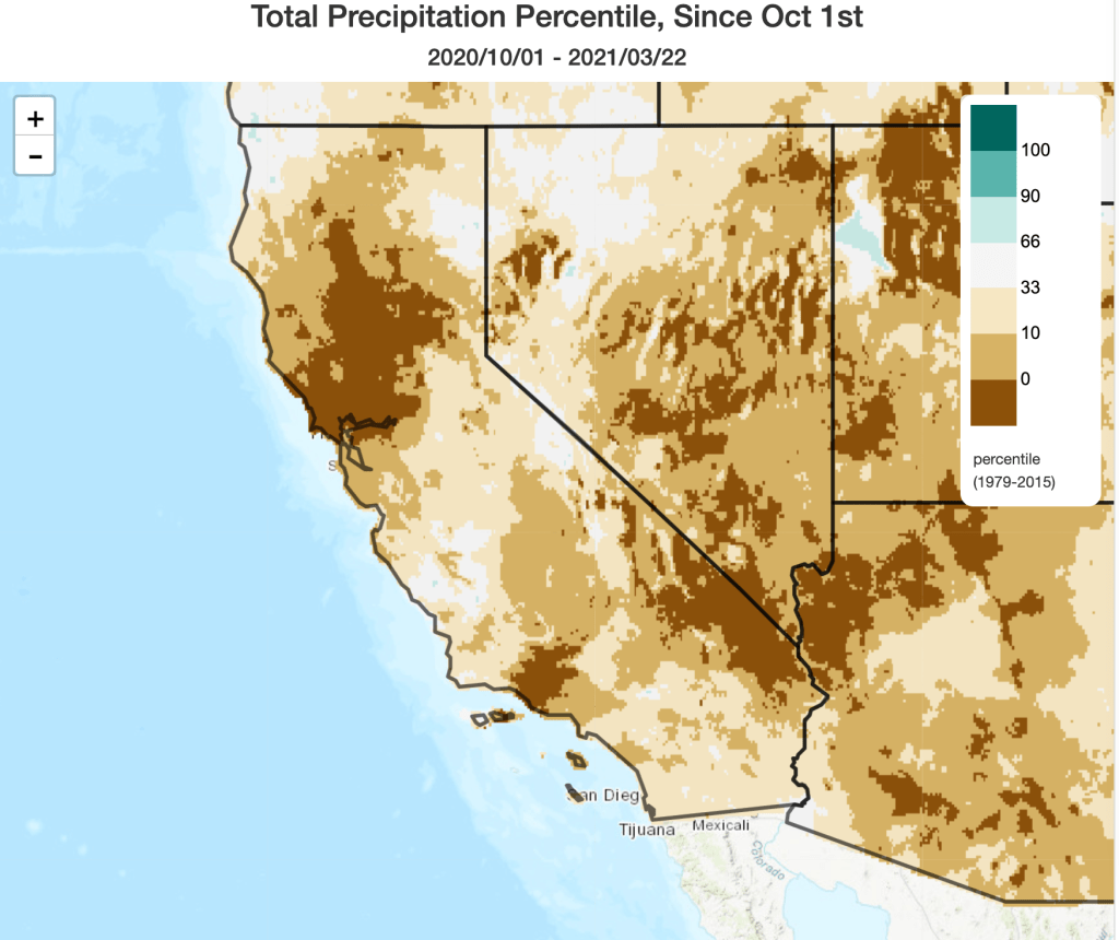 The 2020-2021 “rainy season” to date has, in fact, turned out to be exceptionally dry across portions of California. I think this probably slipped in under the radar, given everything else that has transpired in the world over the past few months, but some parts of northern California (including the SF North Bay, Mendocino County, and much of the central/northern Sacramento Valley) are currently experiencing their driest season since the 1976-1977 drought (and a few places are running behind even that infamous season). This is doubly concerning as these same regions experienced a top-5 driest winter on record just last year–so this is now year two of exceptionally low precipitation in these areas. All of this is amplified by the prolonged periods of record high temperatures and drying offshore winds last year–both of which reduced water availability beyond what would be expected from precipitation deficits alone.