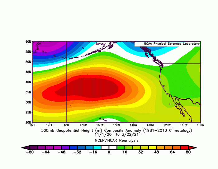 In the past, I’ve cautioned that the existence of a “Ridiculously Resilient Ridge”-like feature is really only discernible in retrospect, when we can be certain that there was actually multi-month persistence of anomalously high mid-tropospheric pressure (geopotential heights). Well, I just looked back at the dismal 2020-2021 season, and…it’s back. The November-March 2020-2021 (to date) North Pacific geopotential height anomalies are plotted (using the ever-useful ESRL plotter) in the map below, and the anomalous ridge signal west of California clearly stands out.