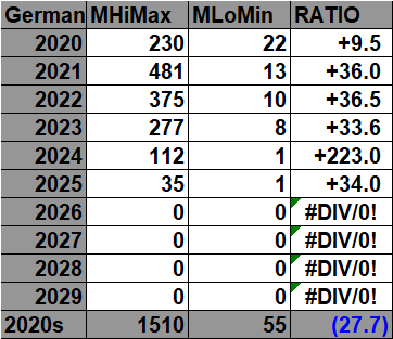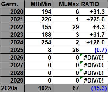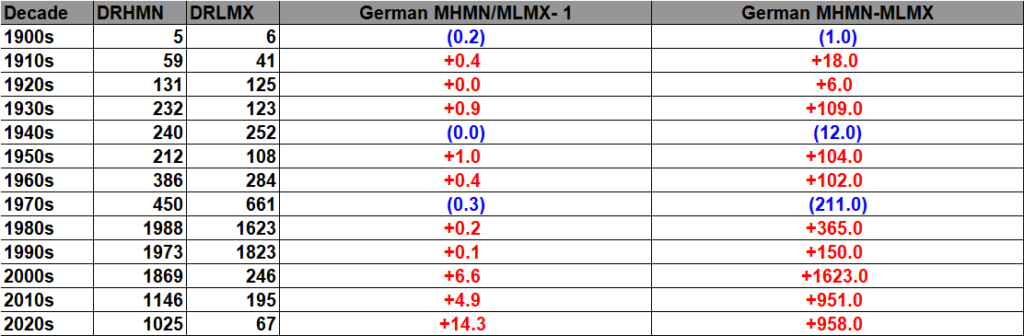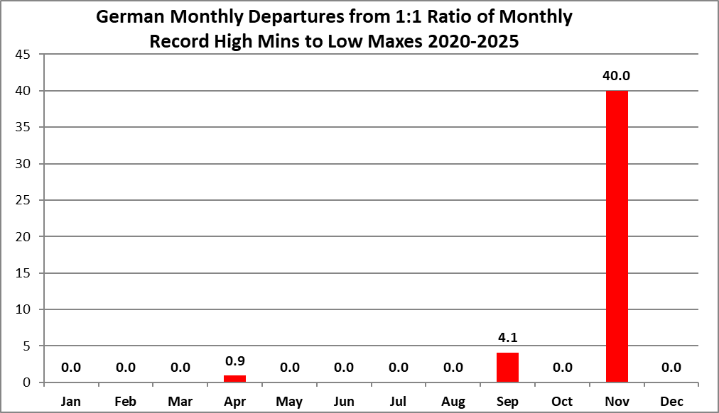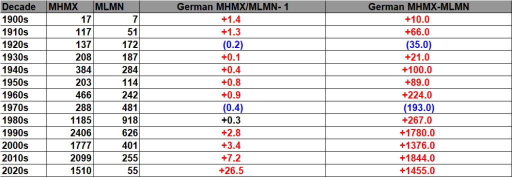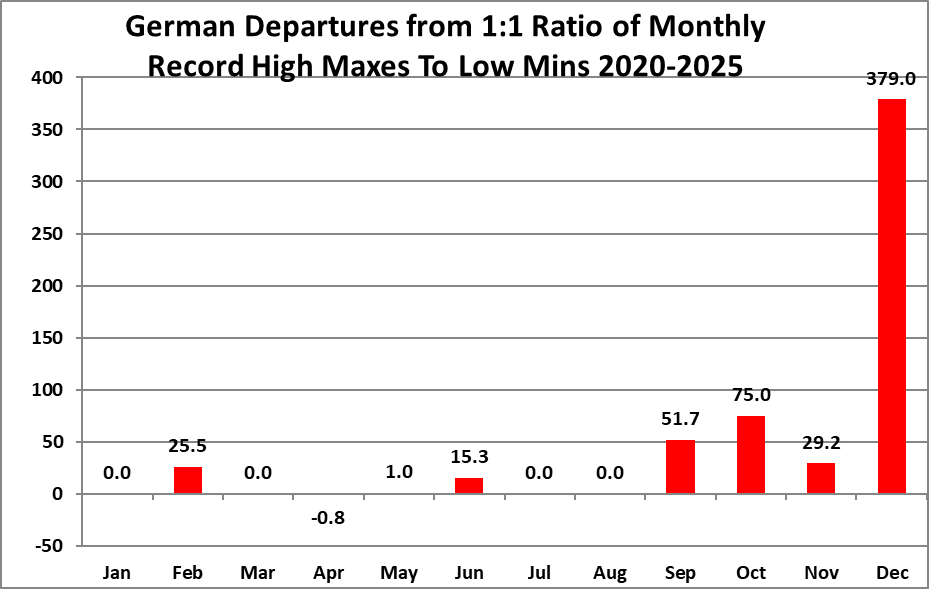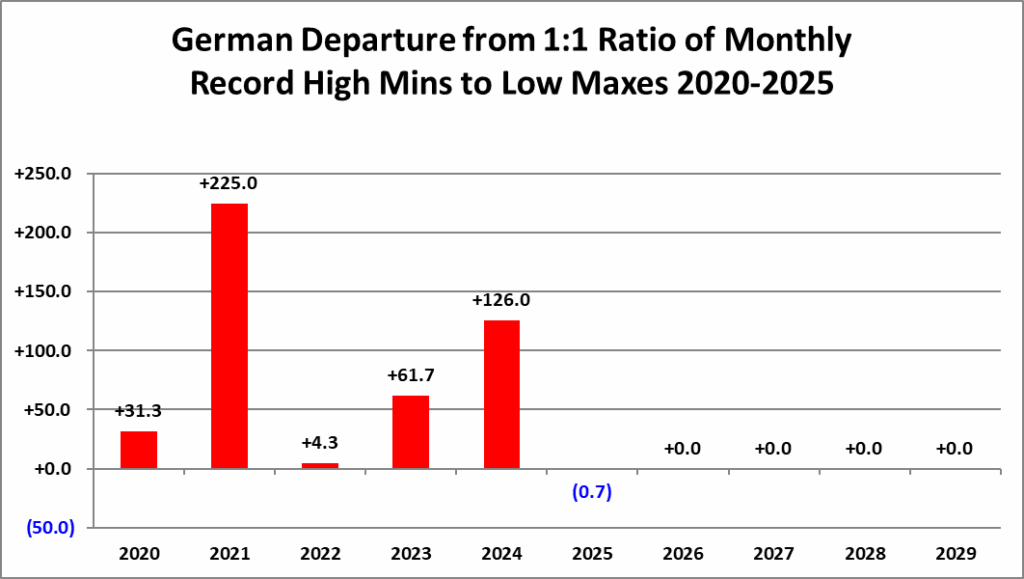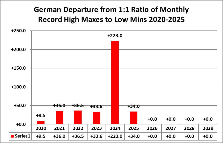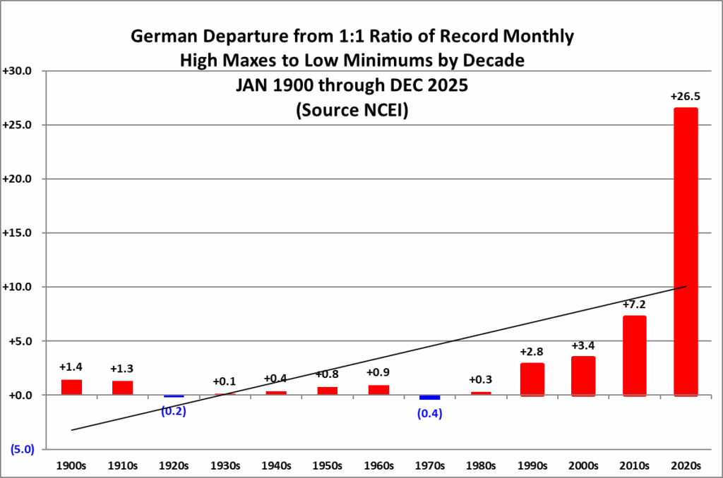 The purpose of this post is merely to catalogue counts of monthly records (high maximums, low minimums, high minimums, low maximums) coming into the National Center for Environmental Information’s site and all related charts and graphs produced in my Excel files for German data sets. Monthly records are those set for the entire period of one month. For example, the highest temperature set during the month of March at Atlanta Hartsville-Jackson Airport was 89F set on 3/23/1995. I am in the process of constantly updating this data verifying the 2009 Meehl et. all surface Records published in geophysical Science that I initiated from 2009. Each individual count could be a tied surface record or one broken by several degrees Fahrenheit.
