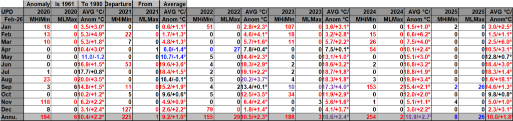 For the following data sets of record of monthly high minimums and low maximums I have opted not to boldly highlight ratios greater than 10 to 1. Blue colors represent cold months and red warm. Those months with counts close to a 1 to 1 ratio of highs to lows are colored black. I have opted not to catalogue data prior to 1900 since record counts decrease substantially prior to the decade of the 1910s. Time stamps for when I last updated counts are located in the upper left-hand corner of each chart. Drop me a note if you see an error or if you have suggestions for improvements.