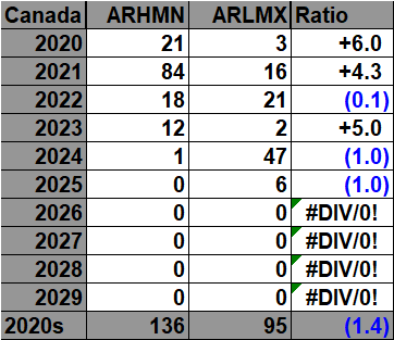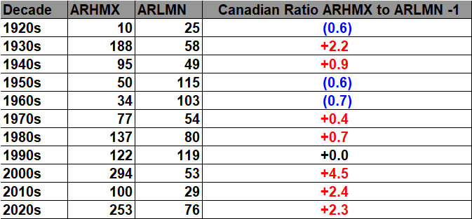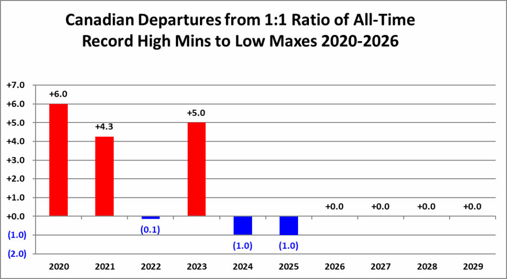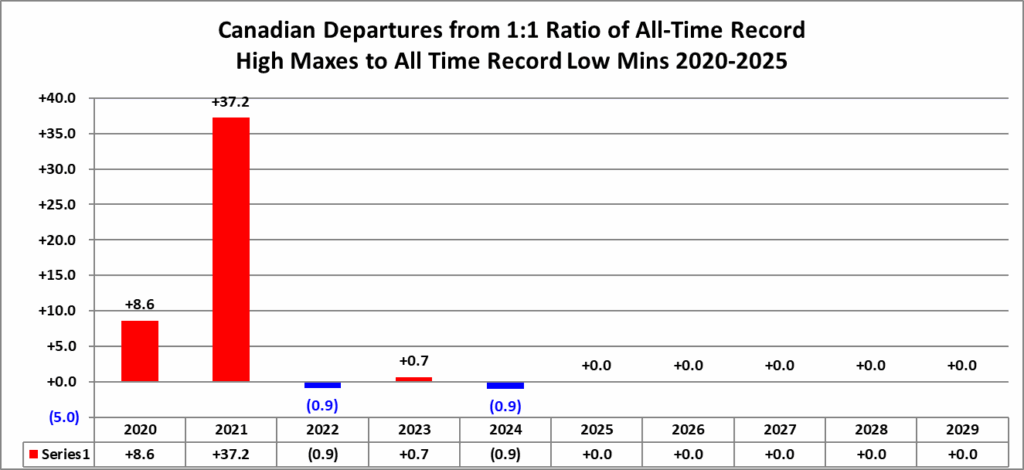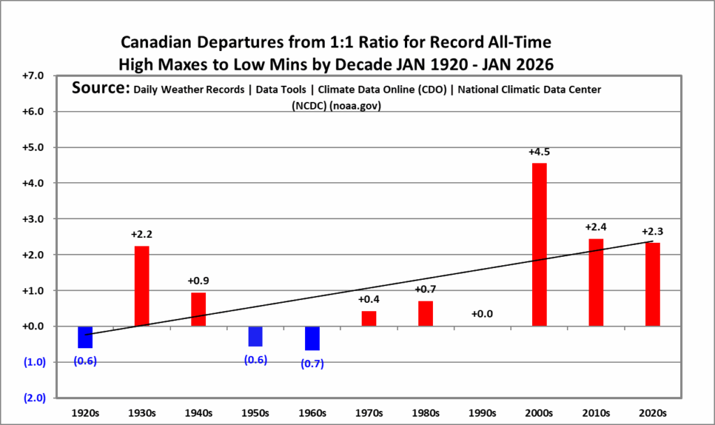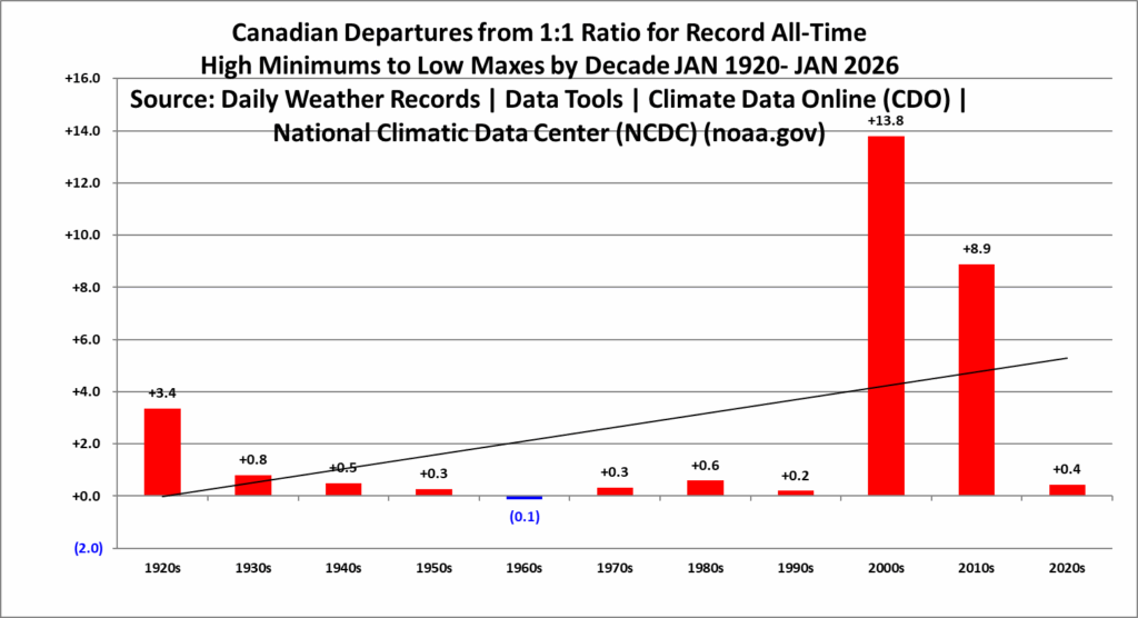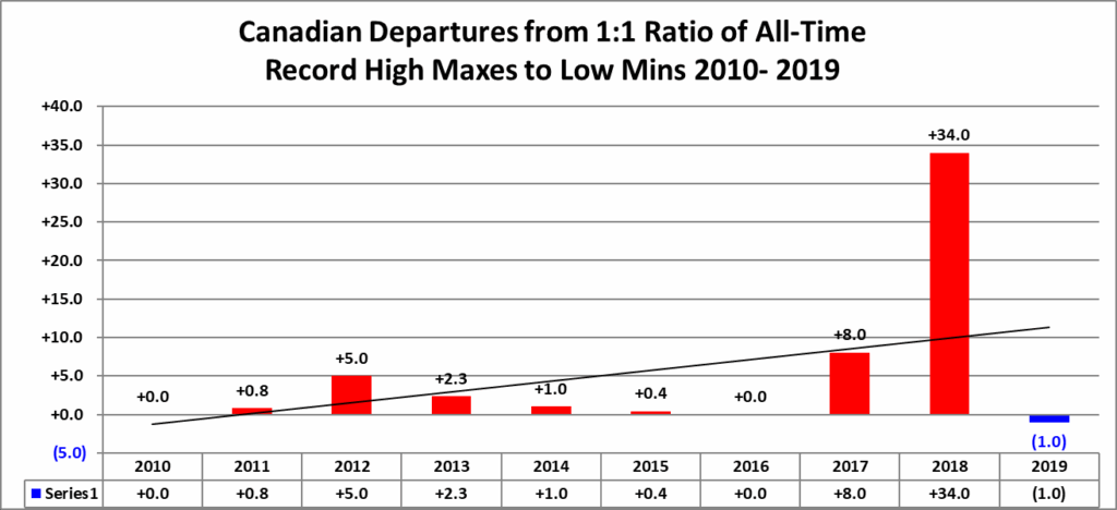 The purpose of this post is merely to catalogue counts of all-time record high maximums, high minimums, low minimums, low maximums coming into the National Center for Environmental Information’s site and all related charts and graphs produced in my Excel files for those data sets for Canada. All-time records are the highest or lowest temperatures recorded over the entire time a station has been recording data. For example, the all-time record for Atlanta Hartsville-Jackson Airport was 106F set on 6/30/2012. I am in the process of constantly updating this data verifying the 2009 Meehl et. all surface Records published in geophysical Science that I initiated from 2009. Each individual count could be a tied surface record or one broken by several degrees Fahrenheit.