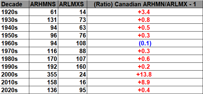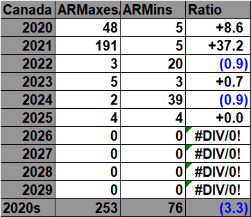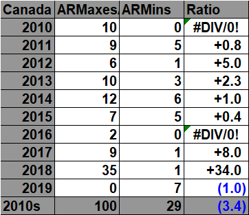 Here are the current all-time record counts of high maximums and low minimums per decade: