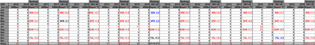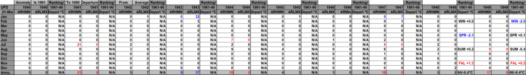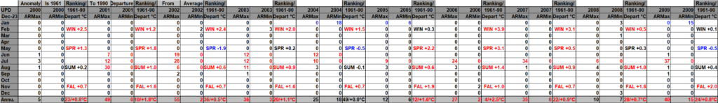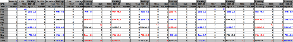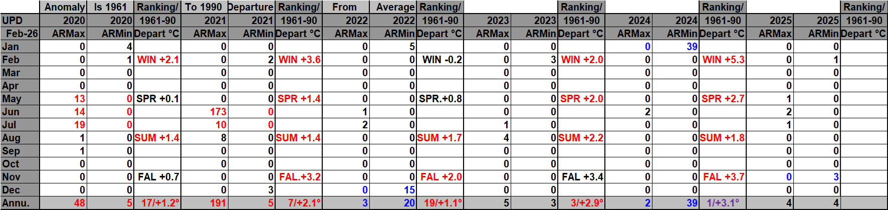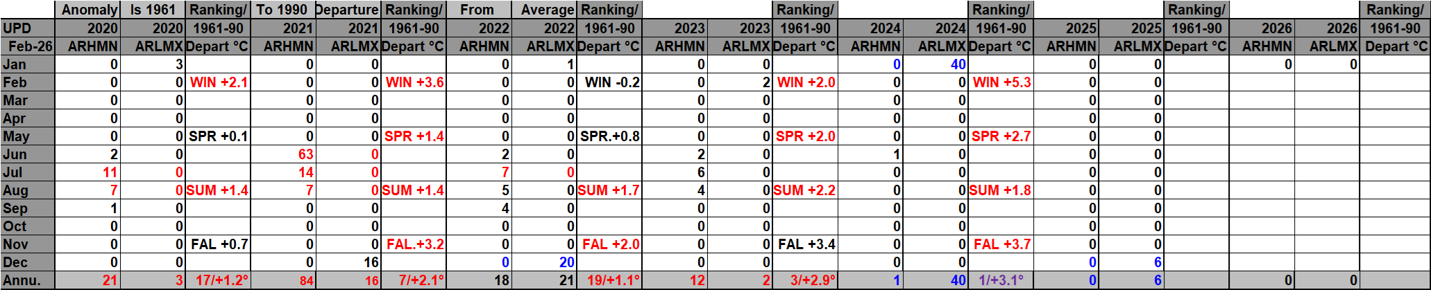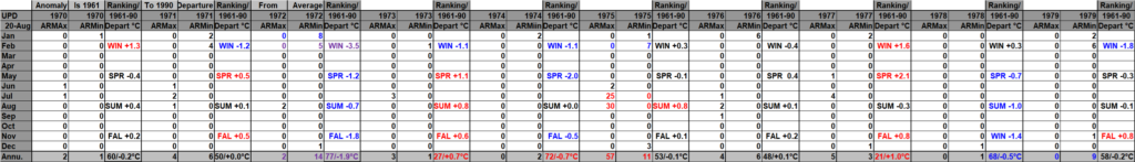 I found this Canadian site that has seasonal and yearly national temp anomalies: Temperature change in Canada – Canada.ca It does not have monthly anomalies and only goes back to 1948, unfortunately. This update includes its data. The Canadian site has yet to include 2025 data, and reports getting into NCEI are incomplete after April 2025, which continue to trickle into their system, thus another reason to create that WMO site. On my chart 2025 was the warmest year in Canadian history, thus it was colored purple. Record numbers correlate fairly well with seasonal anomaly values.