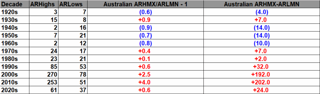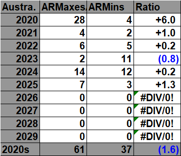 All of the data listed below is part of this one chart. The ratio of all-time record maxes to low time minimums is highest for the 2020s (so far) than any other decade since the 1920s: