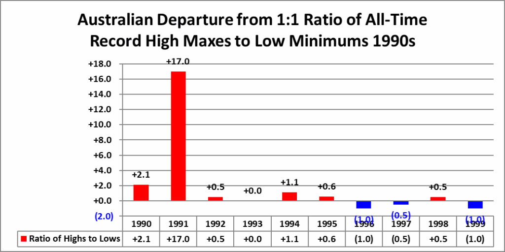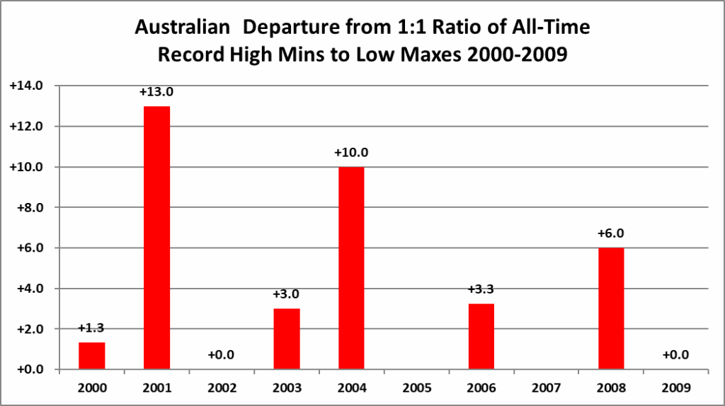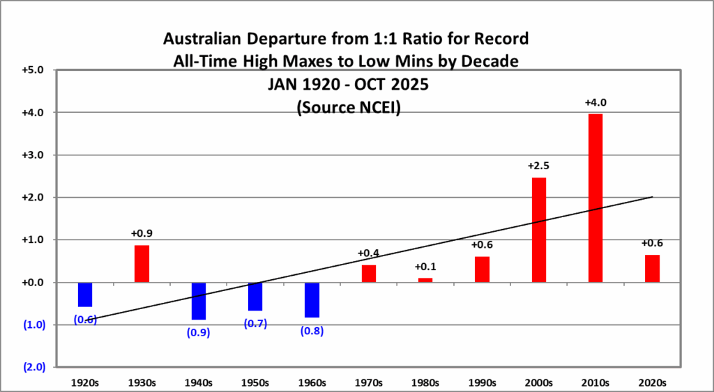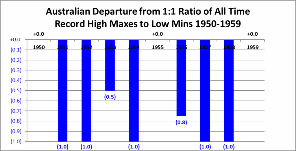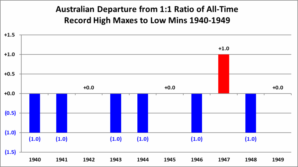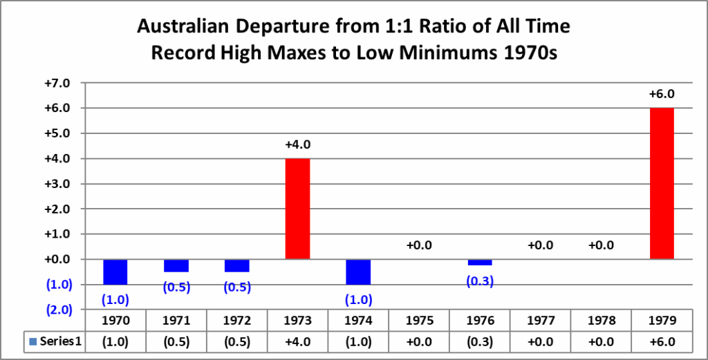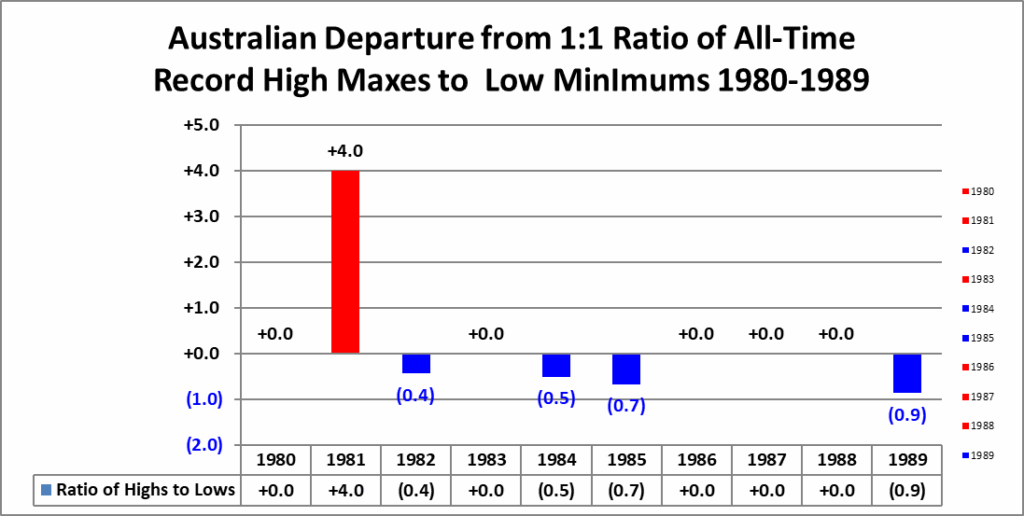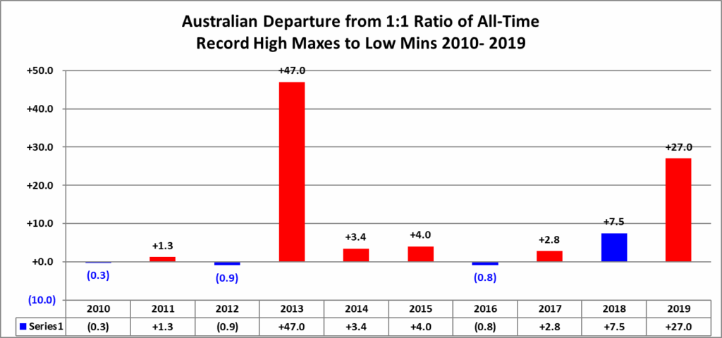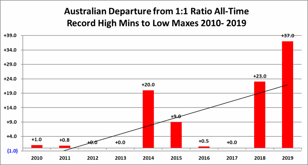 The purpose of this post is merely to catalogue counts of all-time record highs and lows (high maximums\high minimums\low minimums\low maximums) coming into the National Center for Environmental Information’s site and all related charts and graphs produced in my Excel files for those data sets for Australia. All-time records are the highest or lowest temperatures recorded over the entire time a station has been recording data. For example, the all-time record for Atlanta Hartsville-Jackson Airport was 106F set on 6/30/2012. I am in the process of constantly updating this data verifying the 2009 Meehl et. all Surface Records Study published in Geophysical Science that I initiated from the year 2000. Each individual count could be a tied surface record or one broken by several degrees Fahrenheit.