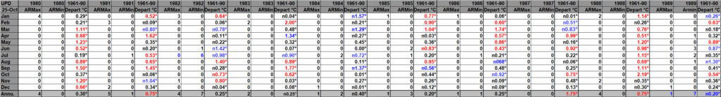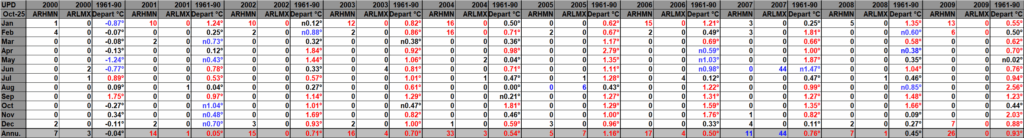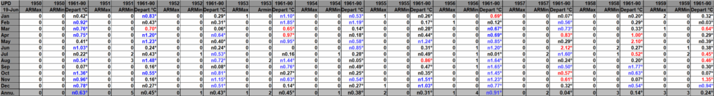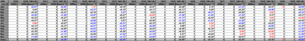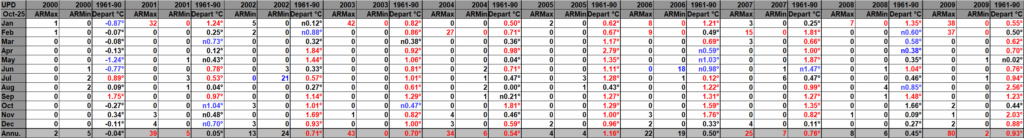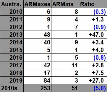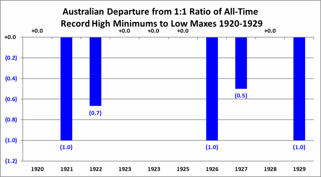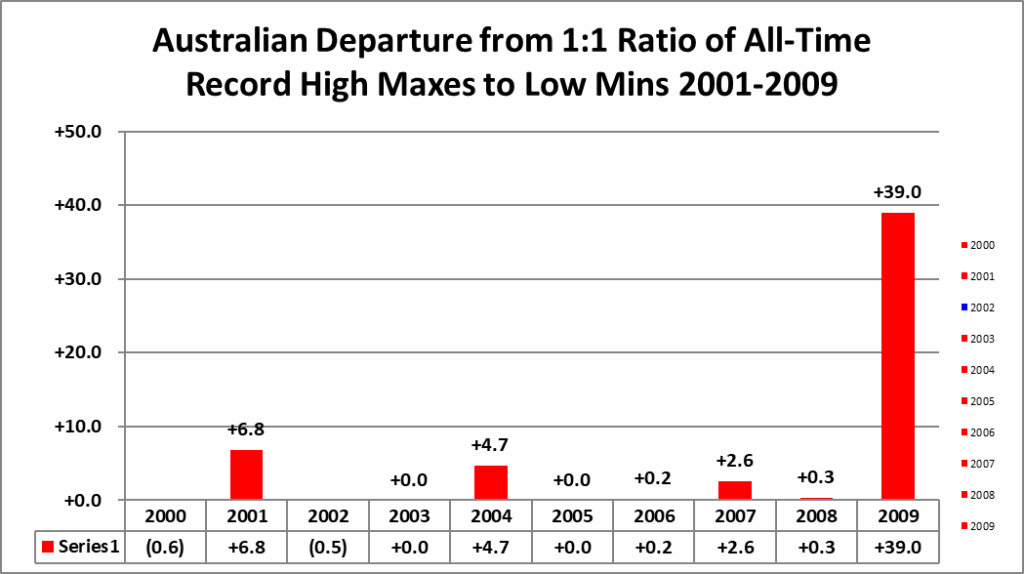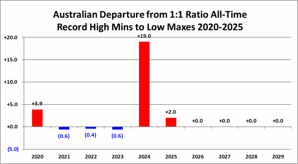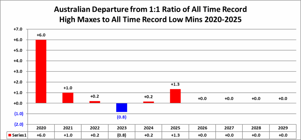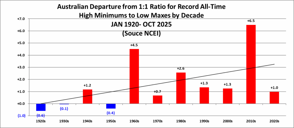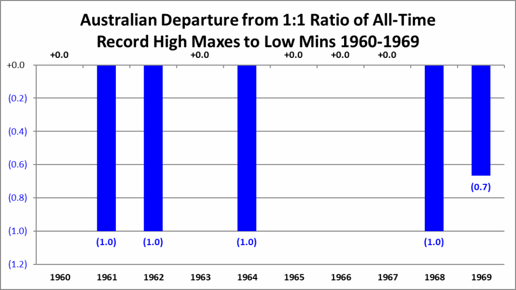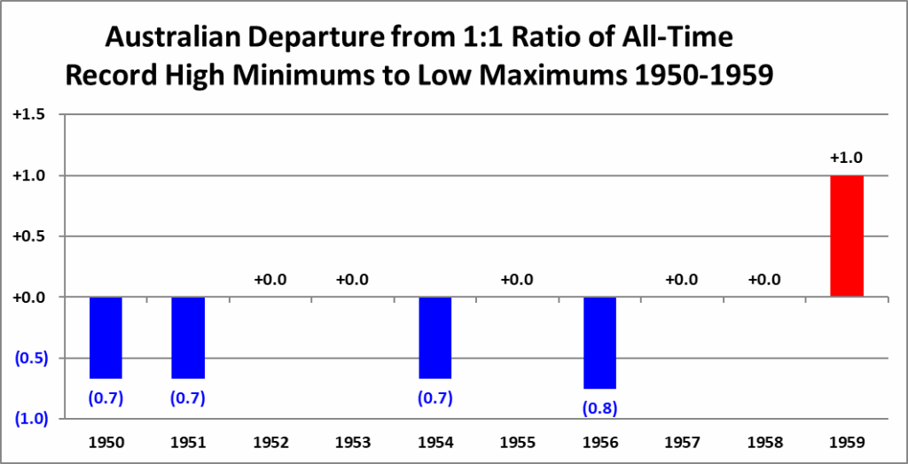 The purpose of this post is merely to catalogue counts of all-time record highs and lows (high maximums\high minimums\low minimums\low maximums) coming into the National Center for Environmental Information’s site and all related charts and graphs produced in my Excel files for those data sets for Australia. All-time records are the highest or lowest temperatures recorded over the entire time a station has been recording data. For example, the all-time record for Atlanta Hartsville-Jackson Airport was 106F set on 6/30/2012. I am in the process of constantly updating this data verifying the 2009 Meehl et. all Surface Records Study published in Geophysical Science that I initiated from the year 2000. Each individual count could be a tied surface record or one broken by several degrees Fahrenheit.