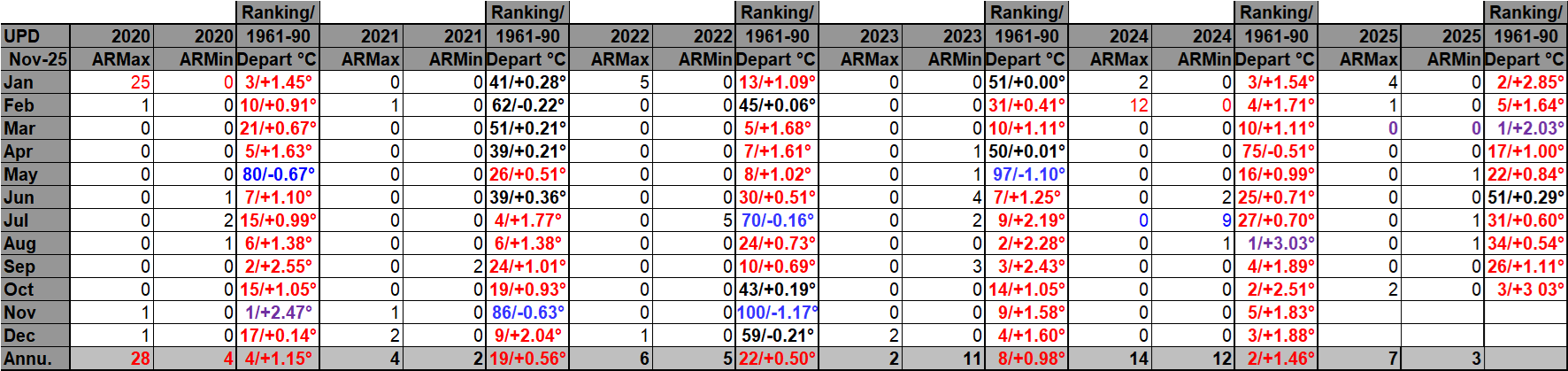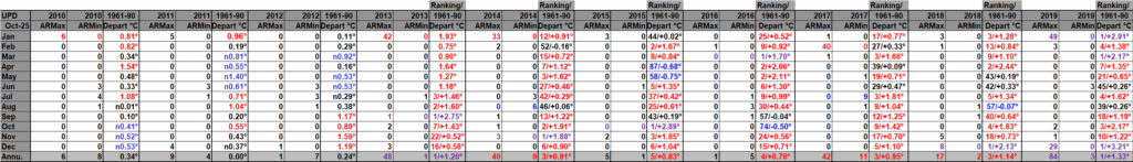 Monthly and yearly Australian national average temperature rankings on charts go back to January 2013. Blue colors represent cold months and red warm. Those months with counts close to a 1 to 1 ratio of highs to lows are colored black. I have opted not to catalogue data prior to 1920 since record counts decrease substantially prior to 1930. Time stamps for when I last updated counts are located in the upper left-hand corner of each chart. Drop me a note if you see an error or if you have suggestions for improvements.