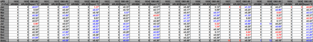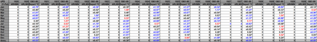 Monthly and yearly Australian national average temperature rankings on charts go back to January 2023. I have added 1961-1990 anomaly values on all charts. Blue colors represent cold months and red warm. Those months with counts close to a 1 to 1 ratio of highs to lows are colored black. I have decided not to catalogue data prior to 1920 since record counts decrease substantially prior to 1930. Time stamps for when I last updated counts are located in the upper left-hand corner of each chart. Drop me a note if you see an error or if you have suggestions for improvements.