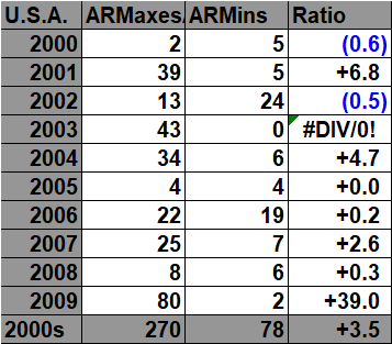 Here are the current all-time record counts of high maximums and low minimums per decade that went into the above chart: