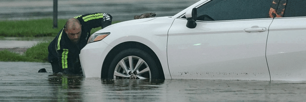 A tow truck driver tries to attach a cable to a car submerged in flood waters on the bank of the Guadalupe River during a search and recovery mission on July 13, 2025 in Ingram, Texas. (Photo by Jim Vondruska/Getty Images)