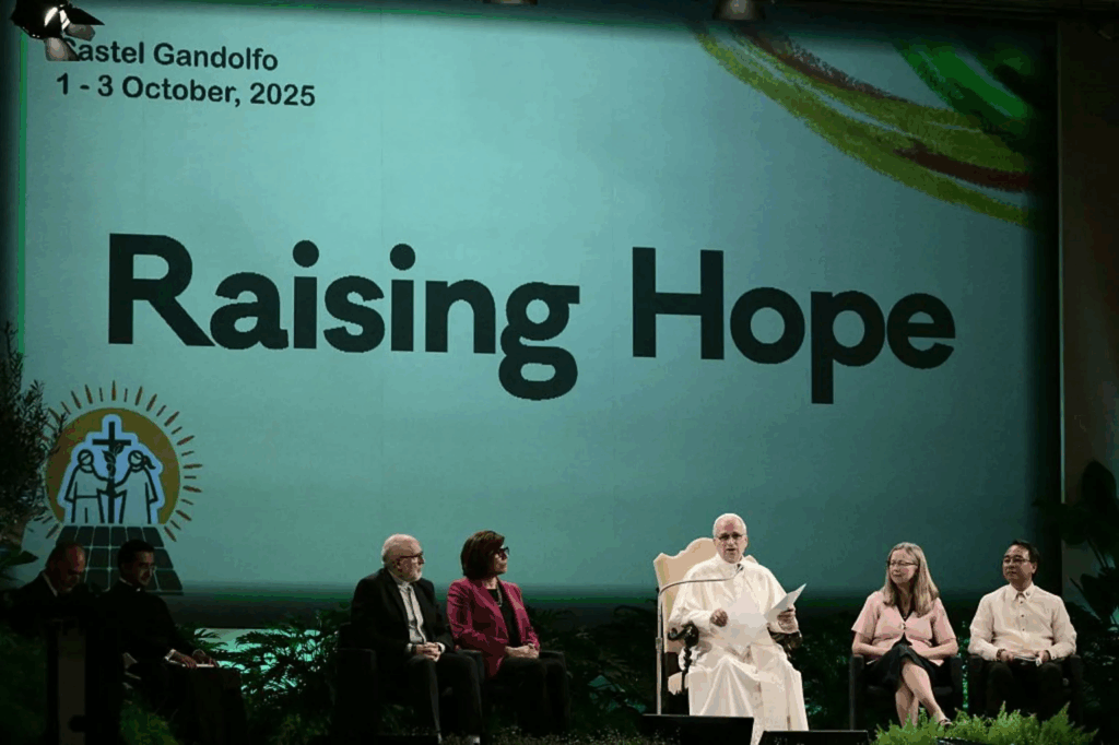 Pope Leo XIV speaking at the Raising Hope climate conference near Rome