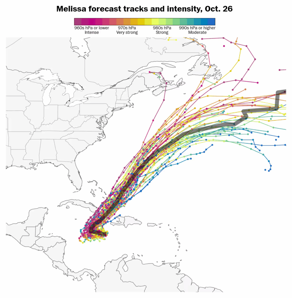 Hurricane Melissa is forecast to make landfall in several places as it travels north over the next week, including Jamaica and eastern Cuba, probably followed by the Bahamas. It will most likely miss North America. Each line indicates a possible forecast track, color-coded by strength. The black line represents the middle outcome of all of the colored lines. (Ben Noll/The Washington Post; data source: ECMWF)