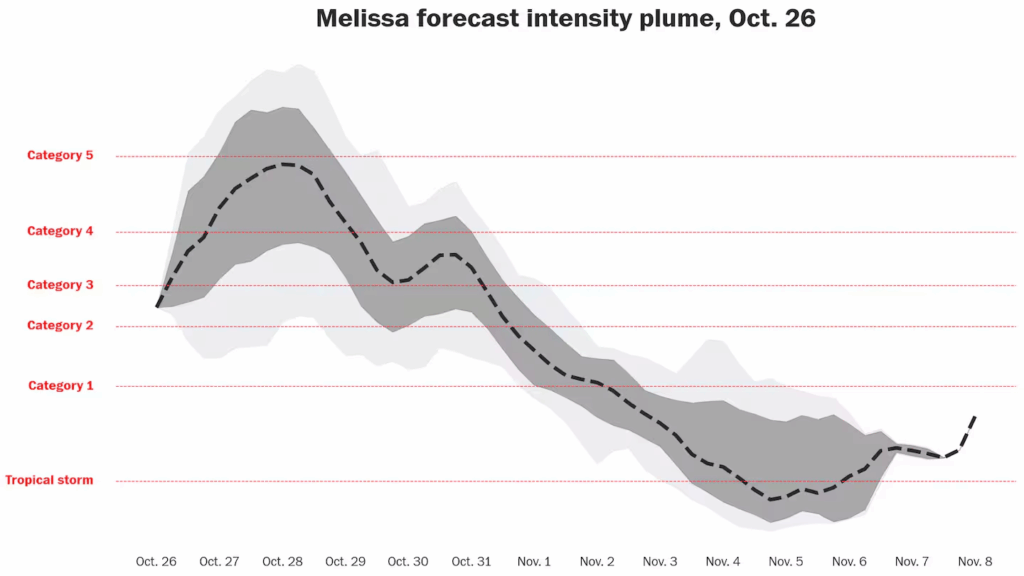 In fact, Melissa’s pace of strengthening was twice the rate needed to qualify as rapid, making the storm extraordinary.