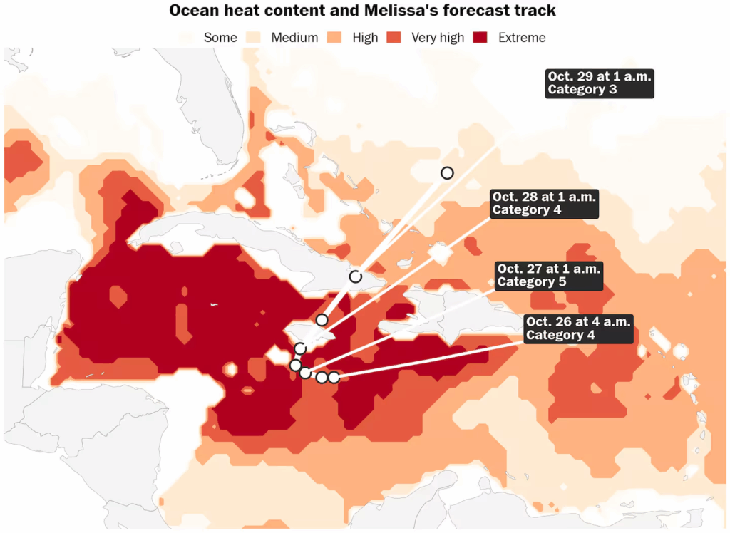 Melissa’s journey over extremely high ocean heat are powering it toward Category 5 strength. (Ben Noll/The Washington Post; data source: NOAA/CoastWatch)