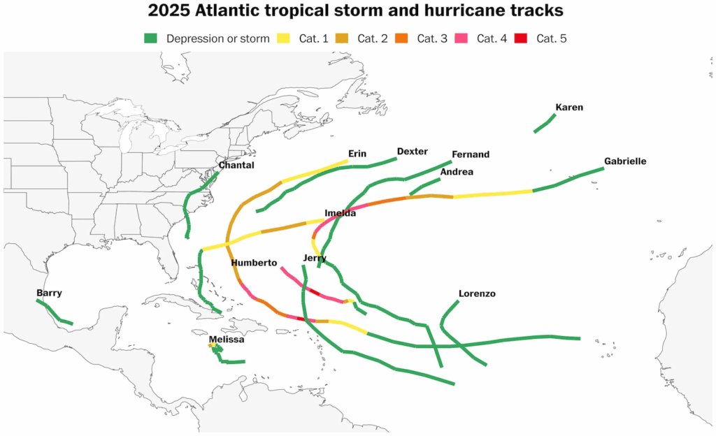 Melissa is the 13th named storm of the Atlantic season and the fourth major hurricane. (Ben Noll/The Washington Post; data source: NOAA)