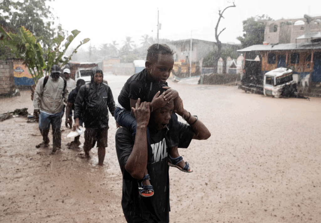 People walk through a flooded street Thursday in Petit-Goave, Haiti, following the passage of Hurricane Melissa. Much of the damage posed by hurricanes is related to precipitation, with warmer atmospheres able to hold more moisture (AFP via Getty Images)