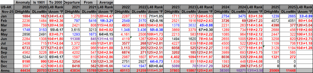 Boldly highlighted red, blue, or purple colored months, such as December 2023 and June 2021, that have ratios of >10 to 1 daily or <1 to 10 of daily warm to low records are either historically hot or cold, most of which have made news. NCEI rankings are for the lower 48 states with the warmest ranking since 1895 of average temperatures being 131 and 1 being the coldest as of 2025. Blue colors represent cold months and red warm. Those months and years with counts close to a 1 to 1 ratio of highs to lows are colored black. All-time record hottest or coldest months and years are boldly colored in purple. NCDC rankings have been color coded (under tabs in each file) such that values of 55 to 75 are black representing neutral months or years (+ or – 10 from the average ranking of 64).