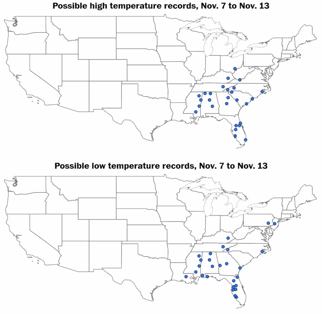In Birmingham, Alabama, temperatures are also projected to see a record cold afternoon maximum temperature of just 46 degrees. The average for early to mid-November is 66 degrees, meaning the Deep South will be running about 20 degrees below average.