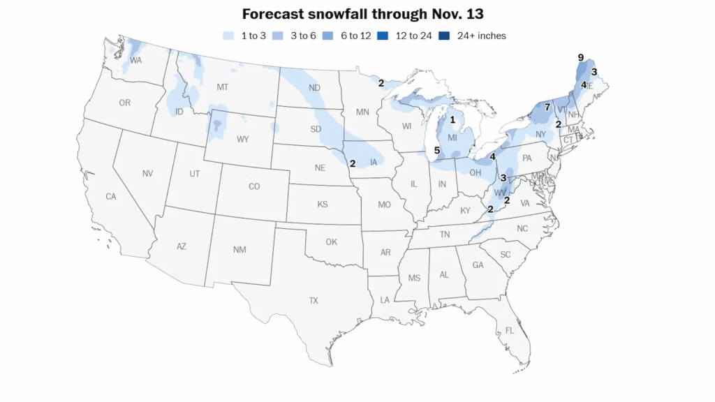 As cold air blows over warm waters and picks up moisture, lake-effect snow streamers may aim at the lakeshores. On Sunday night and Monday, this could include western parts of Michigan’s Lower Peninsula; by Monday evening, the typically vulnerable Lakes Erie and Ontario snowbelts will become involved, including around northern New York’s Tug Hill Plateau, where more than a foot is possible.
