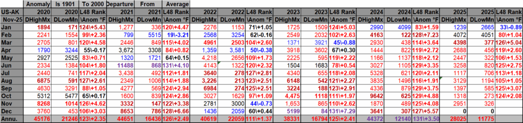 For these data sets all monthly ratios of > 10 to 1 DHMX to DLMN or > 10 to 1 DLMN to DHMX are in bold type. The rankings are for the lower 48 states with the warmest ranking since 1895 of average temperatures being 131 and 1 being the coldest as of 2025. Blue colors represent cold months and red warm. Those months and years with counts close to a 1 to 1 ratio of highs to lows are colored black. Boldly red-, blue-, or purple-colored months, such as January 2020 and October 2024, have ratios of >10 to 1 daily record highs to lows or <1 to 10 daily record highs to lows, and are either historically hot or cold, most of which have made news. All-time record hot or cold ranked months are highlighted in purple. I’ve subtracted Alaska record counts so we can better compare apples to apples with record totals and rankings for the lower 48 states.