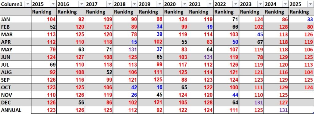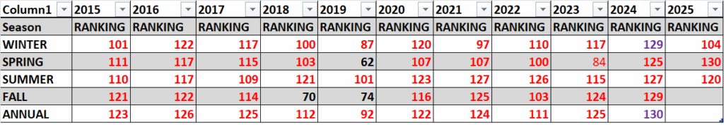 By December 10th the National Center for Environmental Information will finish their climatological assessment for Fall 2025 so our verification is not complete as of November 30th. Let’s do fill in ranking numbers with 1 being the coldest and 131 warmest for a verification for months during 2025, which have already been assessed: