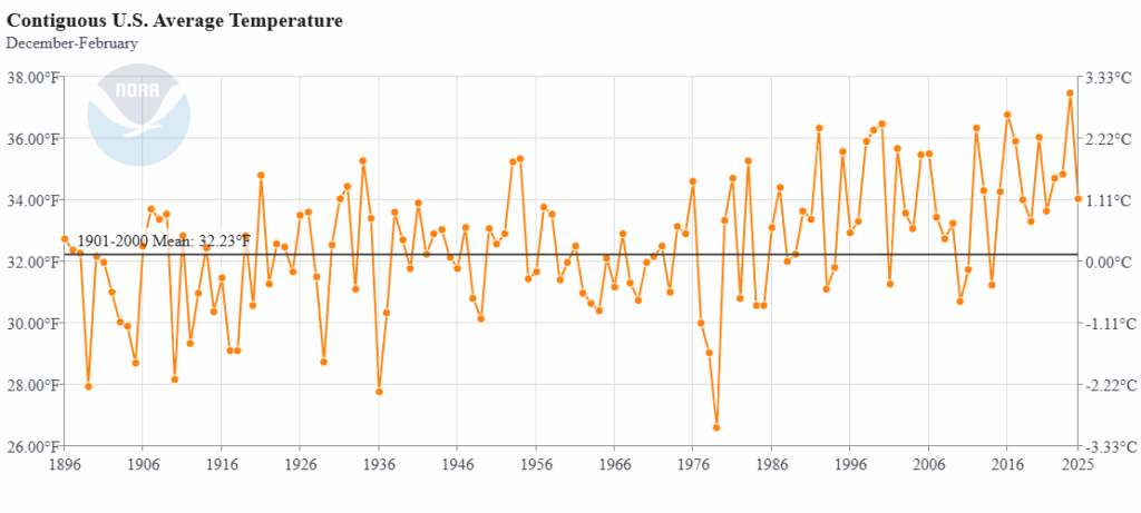 As of 2025 the top ranking for any month or season would be 131 since climatological rankings for the United States started in the year 1895. Carbon pollution is definitely making below average seasons so rare that they are about to be a thing of the past. As stated, I’m going to guess that Winter 2025 gets ranked at 120 + or – 10, and with near average confidence given all of the factors in this post.