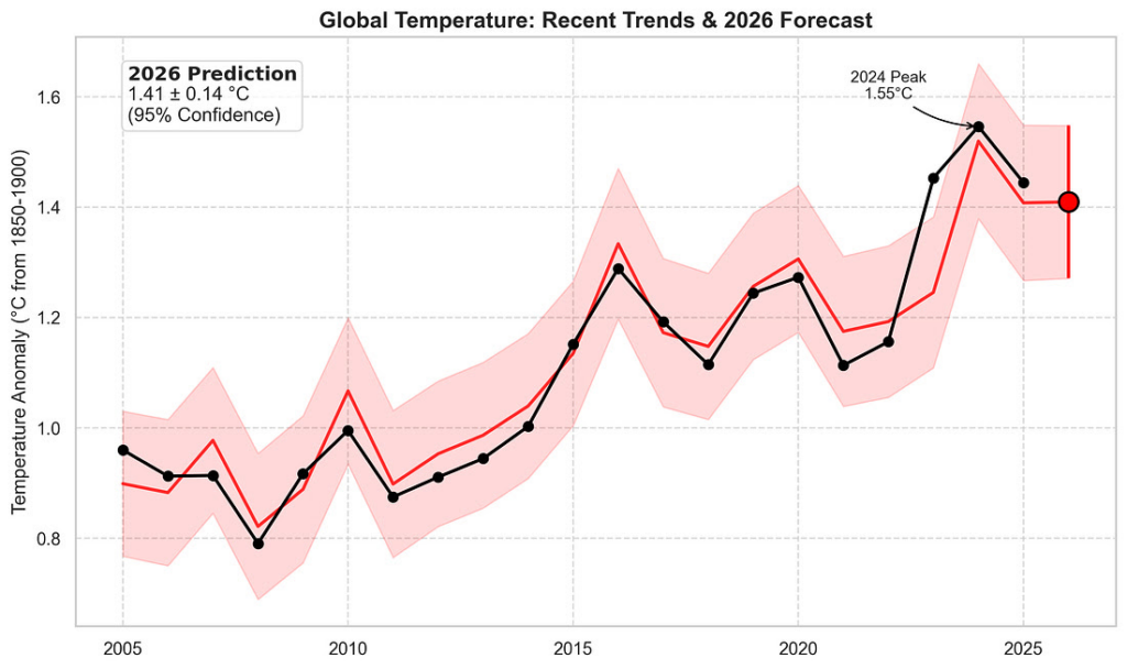 For 2026 I expect global temperatures to be around around 1.41C, with a 95% confidence interval of 1.27C to 1.55C. This means that it is almost certain to be one of the top-4 warmest years, but quite unlikely to exceed 2024’s record. Global temperatures in 2026 will be slightly suppressed by modest La Nina conditions in the tropical Pacific early in the year, while a late-developing El Nino (if it occurs) will primarily affect 2027 temperatures.