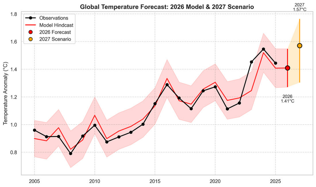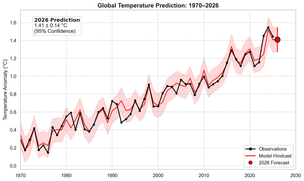 Tis the season for global temperature forecasts. The UK Met Office recently released their 2026 prediction, estimating that it is most likely to end up as the second warmest year on record at 1.46C (with a range of 1.34C and 1.58C) relative to the 1850-1900 preindustrial baseline period.¹ This is likely warmer than both 2023 and 2025² and with a small chance of being warmer than 2024.
