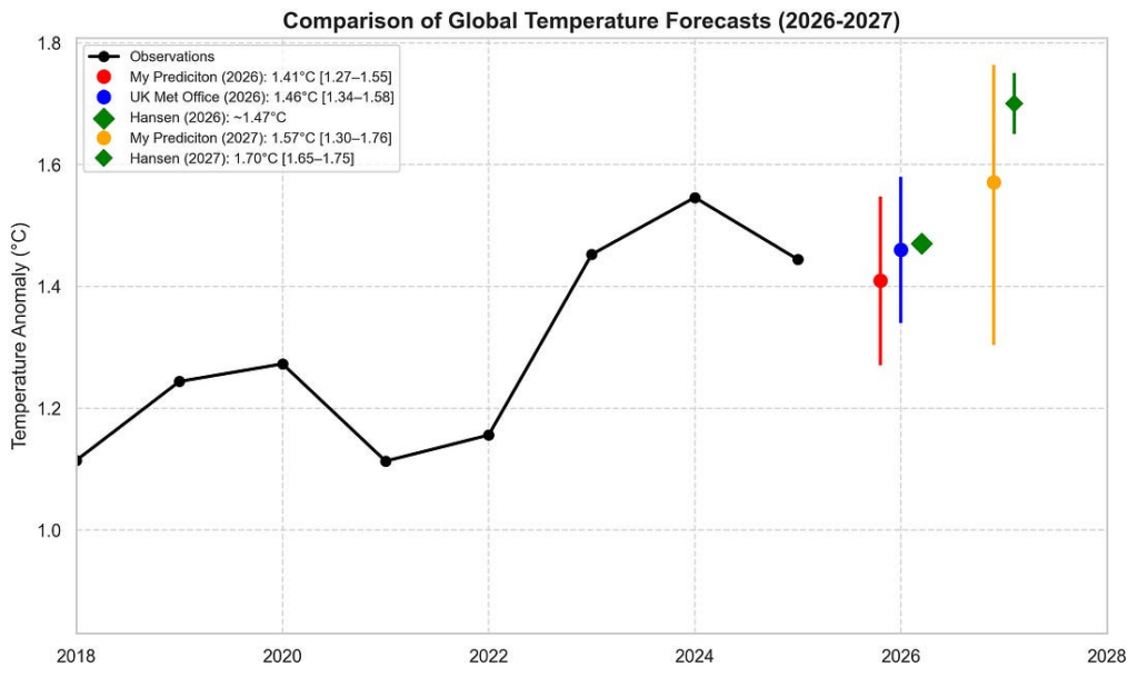 Dear Diary. A few days ago, we got our first global average temperature forecast for 2026 from U.K.’s Met Office, suggesting that it will be near that of 2025 at between +1.29C to +1.53C higher than preindustrial conditions. Let’s round that figure off to +1.4C. Today I noticed a second opinion from Dr. Zeke Hausfather in my Gmail in box.