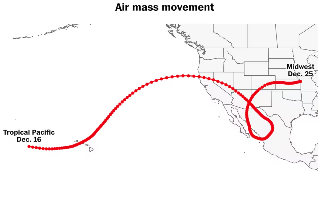 These two features are causing the air to take a looping 4,000-mile path from the tropical Pacific Ocean near Hawaii — a warm and humid place — to Mexico before reaching the Midwest on Christmas.