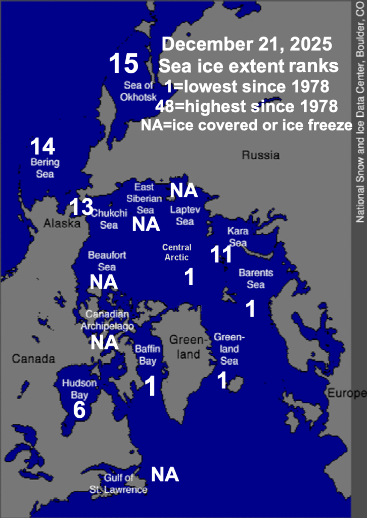 This record low extent is not a blip: Arctic-wide sea ice extent has been the lowest in the satellite era every day since late November (Fig. 2) in NSIDC data. So far in 2025, 106 days rank as the “lowest sea ice extent for the date”, including long stretches in late last winter and in early summer.