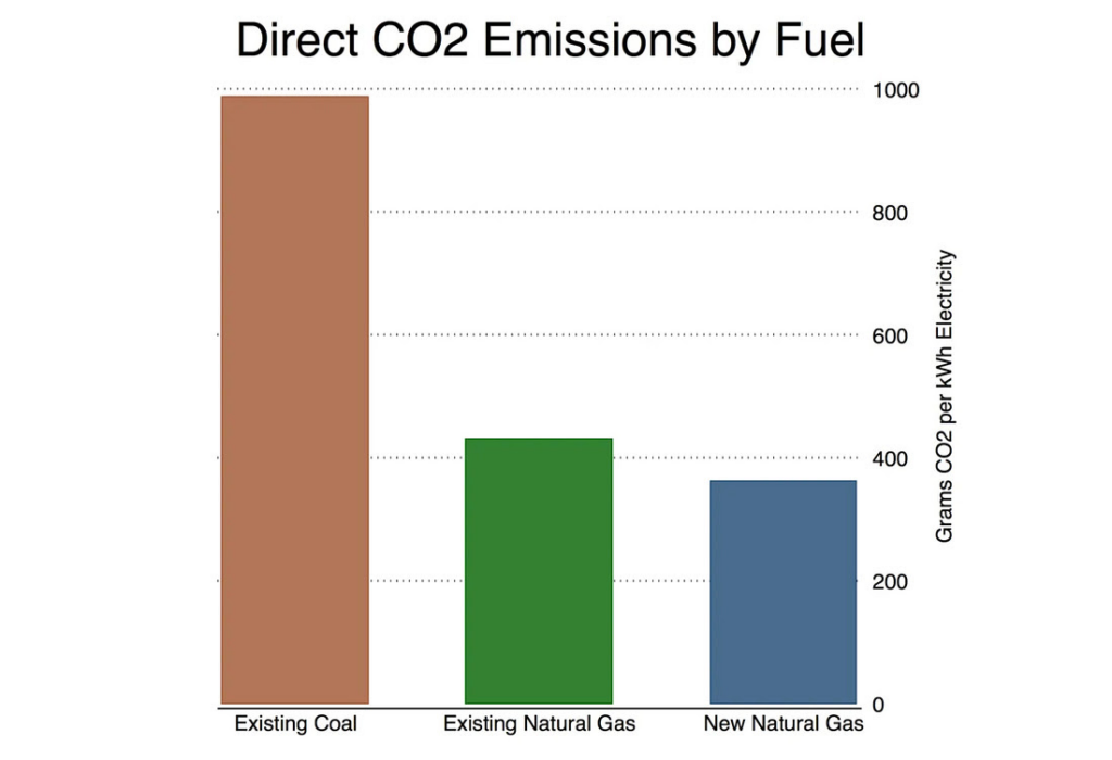 From a carbon standpoint the comparison is relatively straightforward. Natural gas is results in about 60% lower CO2 emissions per kWh generated, as shown in the figure below: