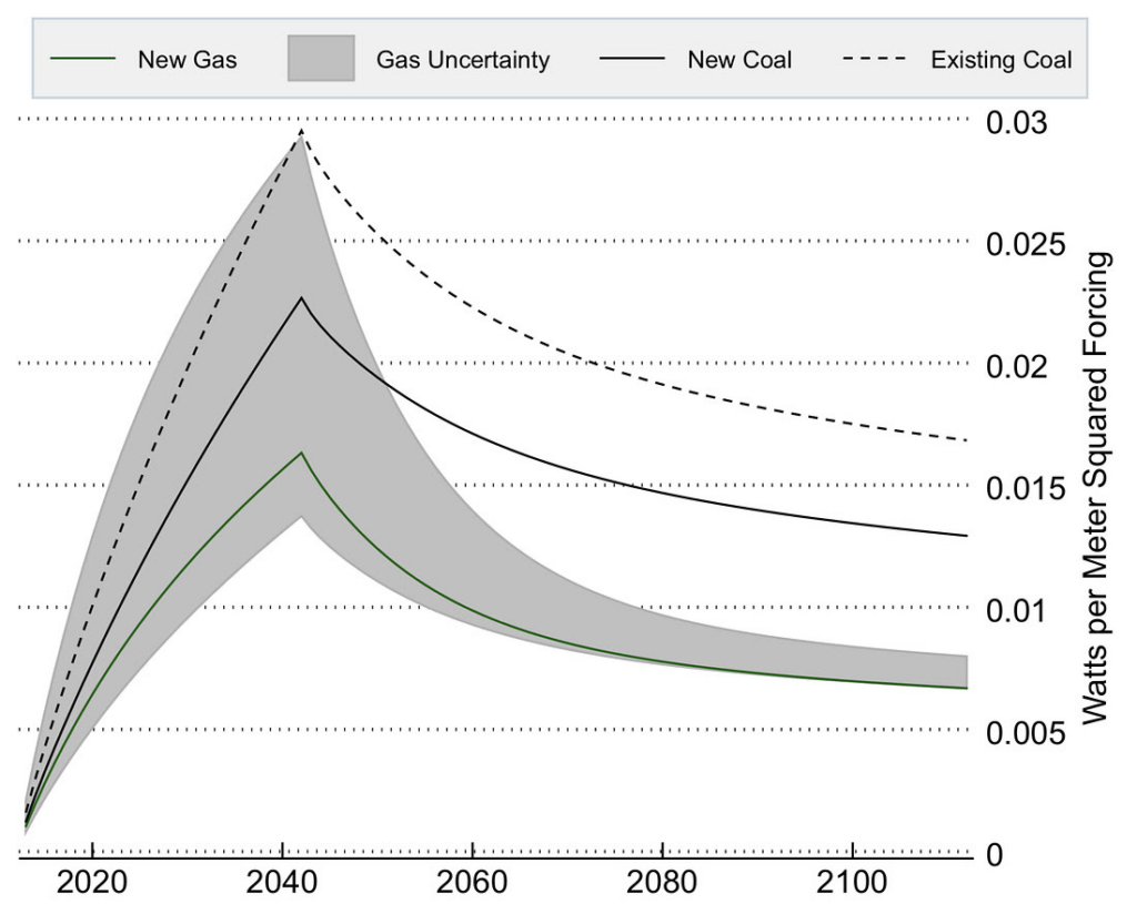 The figure below (from my 2015 paper) attempts to compare gas and coal climate impacts over time, using the change in radiative forcing of both (which is a reasonably proxy for temperature change). It compares a new gas plant in the US with 2% leakage (green line) to both new coal (black solid line) and existing coal (black dashed line). The grey area represents the uncertainty for gas across leakage rates from 1% to 6% and generation efficiencies (HHV) of 42% to 50%. This plot assumes that both the gas and coal plant would be operated for 30 years before being retired.