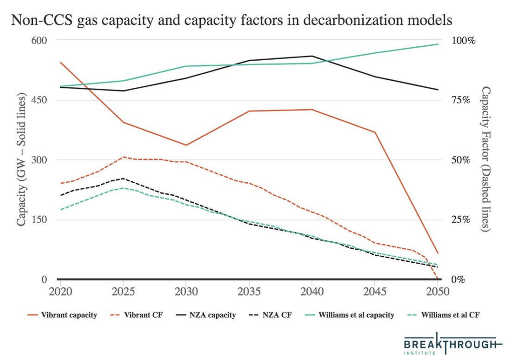 Of course, the argument that gas is“worse than coal” is an unnecessarily high bar in a world that needs to get to net zero emissions. But gas displacing coal is generally still a good thing today, provided there are no other viable cheaper options. Gas also is something of a Swiss army knife of the electricity system, able to be built quite cheaply but expensive to operate (e.g. low cap-ex and high op-ex). This makes it quite well suited to be a dispatchable resource; cost effective to shut down during periods when cheap renewable or battery storage is available, and able to run when extended low resource outputs makes it necessary. That is one of the reasons why deep decarbonization scenarios for the US generally have considerable amounts of natural gas capacity remaining in a net-zero system in 2050, even if utilization rates are quite low (~5%).
