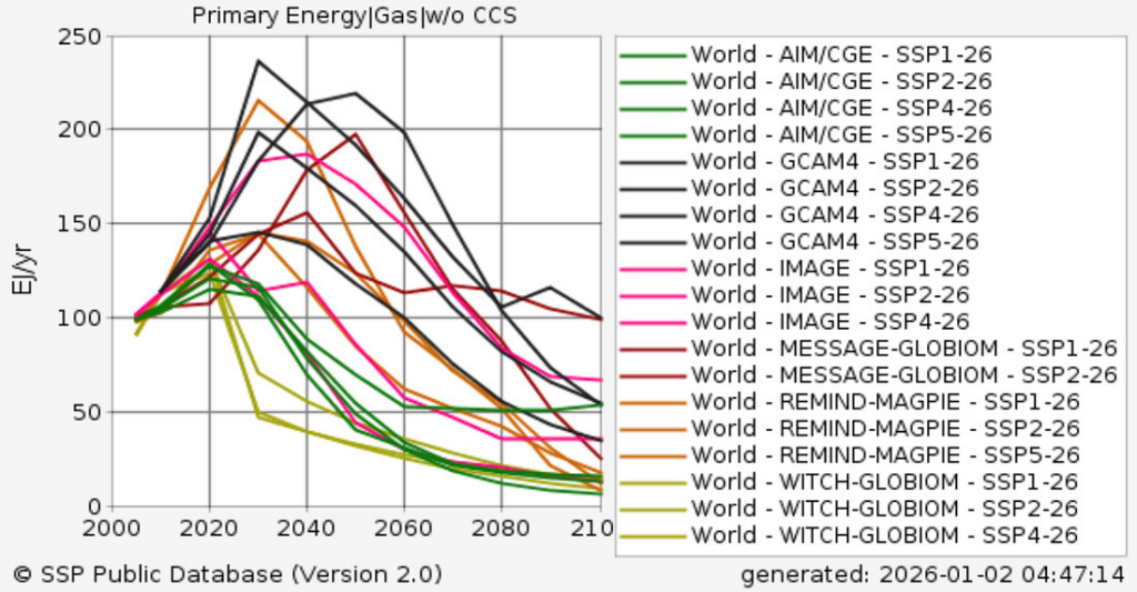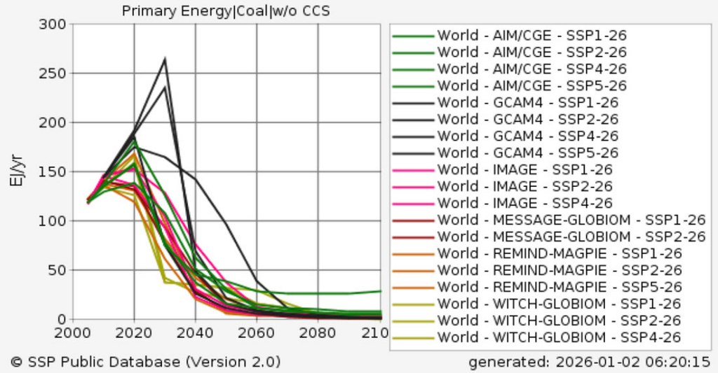 More broadly, integrated assessment models used by the IPCC to assess mitigation options have a pretty clear load order for phasing out fossil fuels: coal first, than oil, than gas. For example, here is unabated (without CCS) coal use in 2C scenarios (SSP1-2.6) in the SSP Database used in the IPCC 6th Assessment Report, showing rapid declines in global coal use after 2020 (something that, unfortunately, we have yet to see globally in the real world).