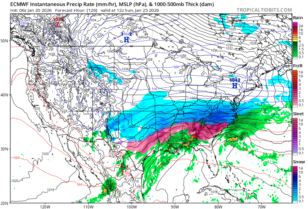 Here is what I wrote on Facebook last night concerning my hometown of Atlanta: I haven’t seen a whopper of a winter storm like this on met models across the South since before the year 2005. People across the South, and especially for my friends in Atlanta, need to be prepared to deal with snow, but freezing rain could be the worst problem. We haven’t seen an extreme ice storm here in Atlanta since 1973 (defined as one that causes power to be cut by at least a week across practically the entire city). A mostly sleet storm here might spare Atlanta, but freezing rain would be bad to our south. Stay tuned to experts from the National Weather Service on this one. P.S. There will be a run on grocery stores, so act accordingly, stocking up Tuesday and Wednesday. And yes, climate change naysayers will be laughing at climate change scientists when all is said and done, unfortunately.