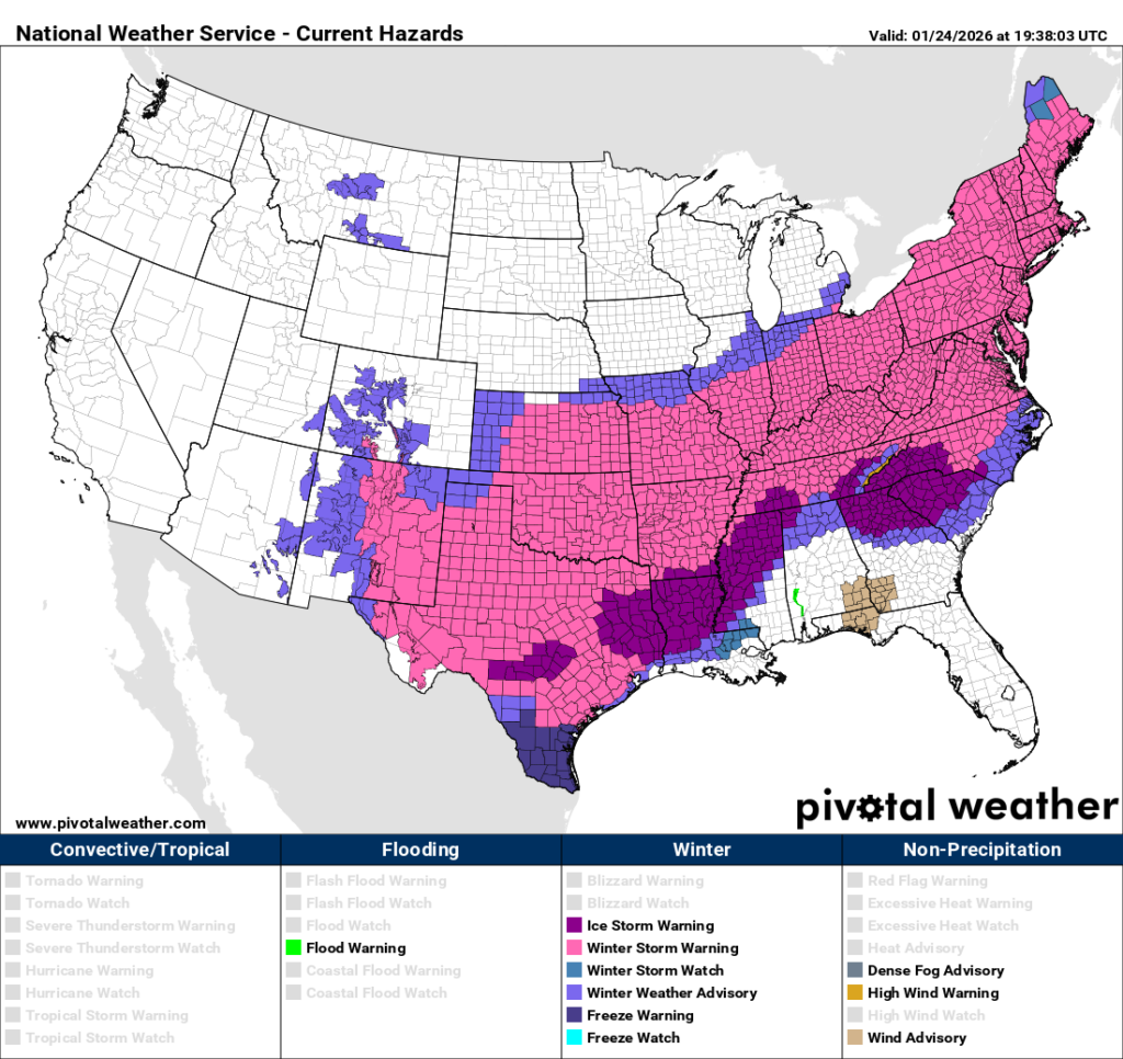 In southeastern Arkansas, an ice storm warning is in place. The situation there looks serious, with long-lasting power outages and tree damage possible.
