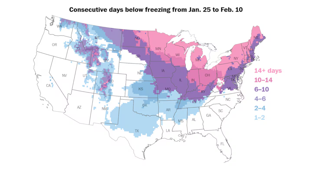 A massive winter storm that blanketed about 220 million people across the United States with heavy snow, crippling ice and widespread power outages cleared by early Monday but left behind a bone-deep chill. Dangerous and record-breaking cold temperatures have settled in. The impact of the cold will be amplified by how long it will last. In many areas — including the nation’s capital — temperatures may not rise above freezing until early February, part of a streak that started in D.C. on Friday evening.
