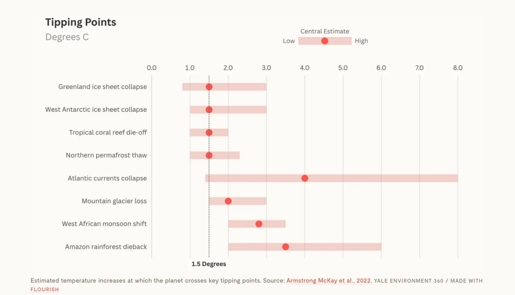 If we don’t radically alter course — and, let’s be real, there’s little sign that’s happening yet — we will, sooner or later, begin triggering planetary tipping points. Natural systems (upon which our very ability to manage our societies depends) will snap into new states, rendering every place, human system and pattern of living permanently altered. Even at 1.5ºC, we’re teetering on the threshold of a one-way visit to an alien world.