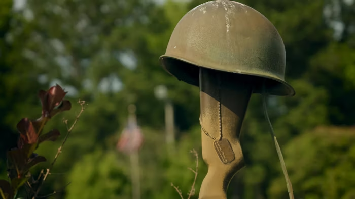 A helmet and dog tag are seen in Camp Lejeune, North Carolina in a still from the film Earth’s Greatest Enemy. (Image via Empire Files)