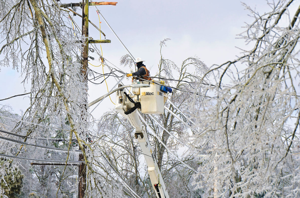 A utility worker restores power in Mississippi, following a January storm that dropped tens of millimeters of freezing rain. Bruce Newman/AP