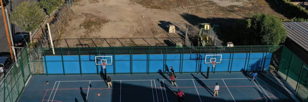 Children play basketball beside an oil well pump jack and tank, in the Wilmington neighborhood of Los Angeles, California, on February 24, 2022. (Photo by Robyn Beck/AFP via Getty Images)