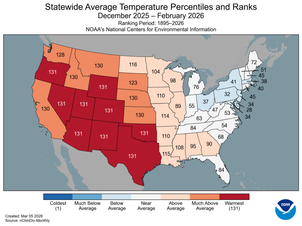 Here’s a breakdown of the National Climatic Center’s ranking numbers by state for Winter 2025/26, which was ranked at 2nd warmest or 130th coldest (or a Powerball ranking of 130):