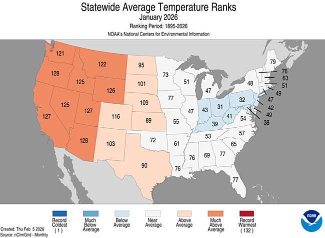 January 2026 was the coldest month of Winter 2025/26 relative to average. Warm conditions relative to average were widespread across the West. Just like in December, the coldest conditions were across portions of the East.