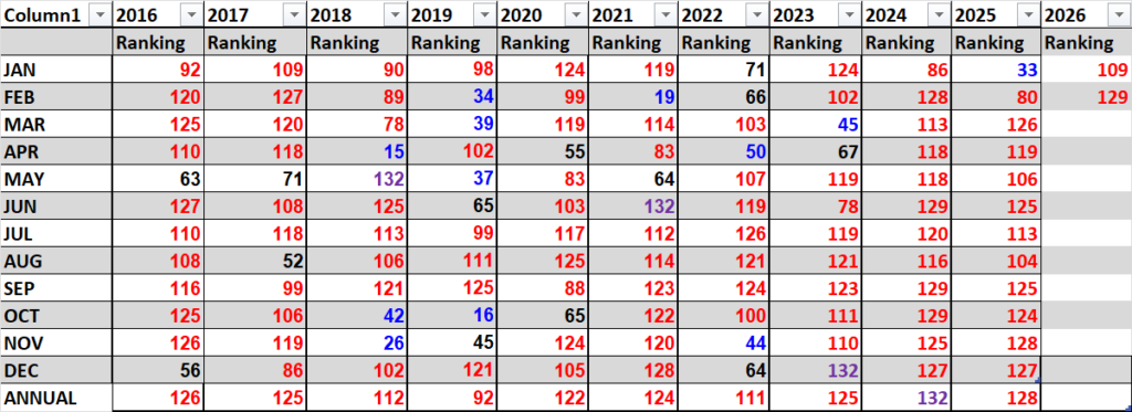 The following are the rankings, so far, for individual months or “Climate Lottery number picks” from 2016-2026: