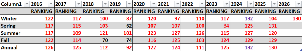 Seasonal or Power Ball rankings for winter are those for DEC/JAN/FEB, spring are MAR/APR/MAY, summer JUN/JUL/AUG, and fall SEP/OCT/NOV. Mega Ball rankings for each year are included on the chart below. Also, keep in mind that NCEI rankings for seasons are not merely an average of rankings of individual month of a season or year, as was the case for Winter 2025/26- 127/109/129 P.B. 130: